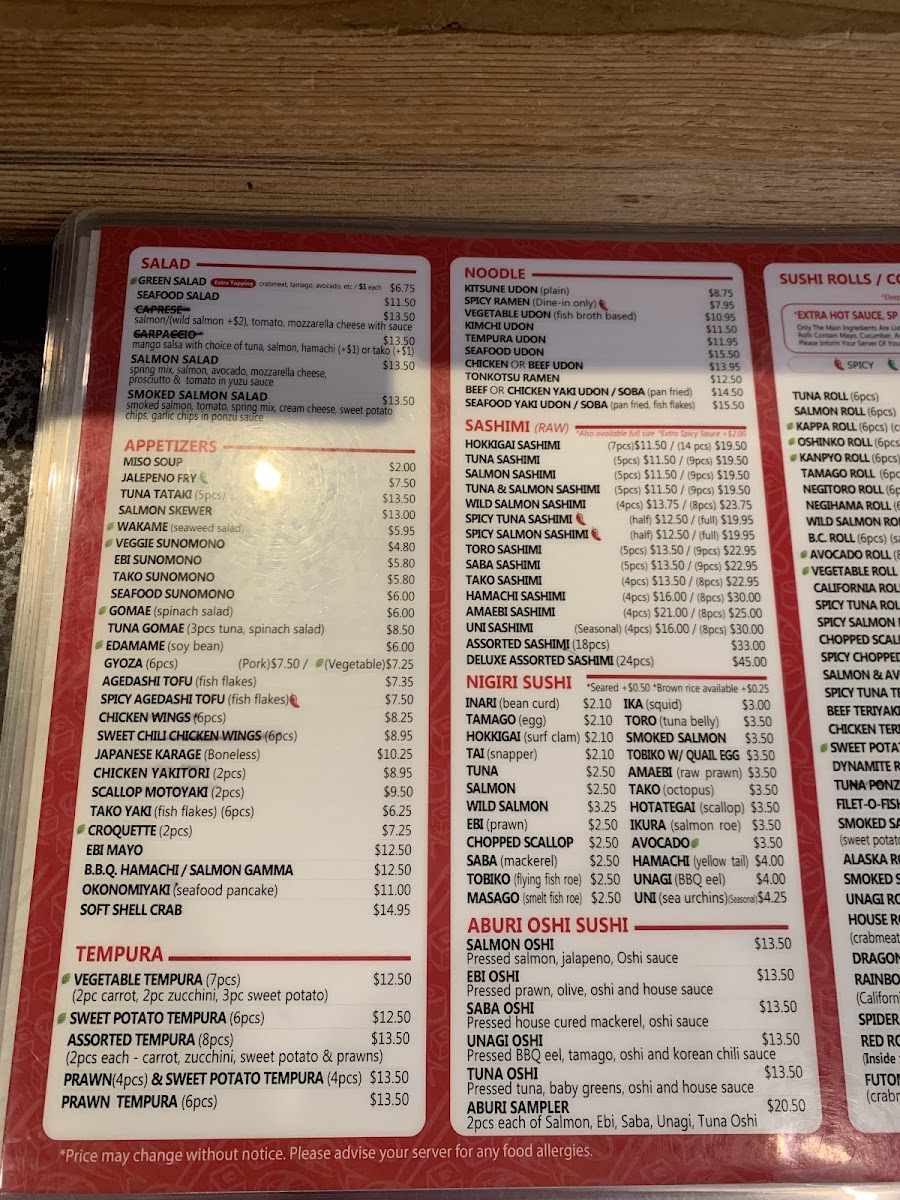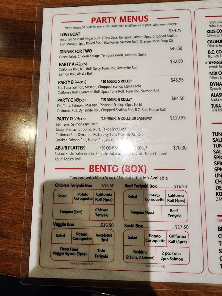 The menu offers a diverse range of Japanese cuisine primarily focused on sushi and related dishes. It is organized into several key categories to accommodate various dining preferences.