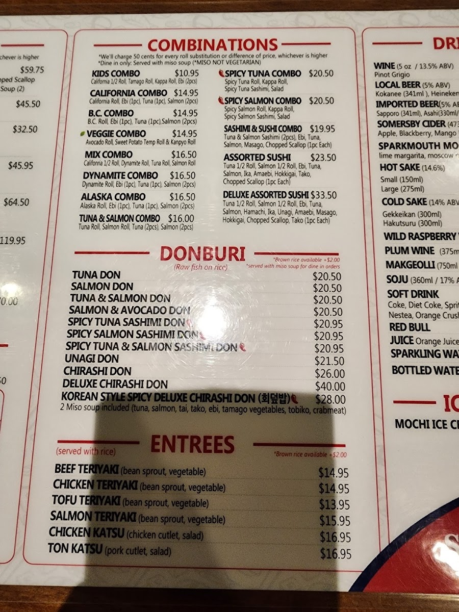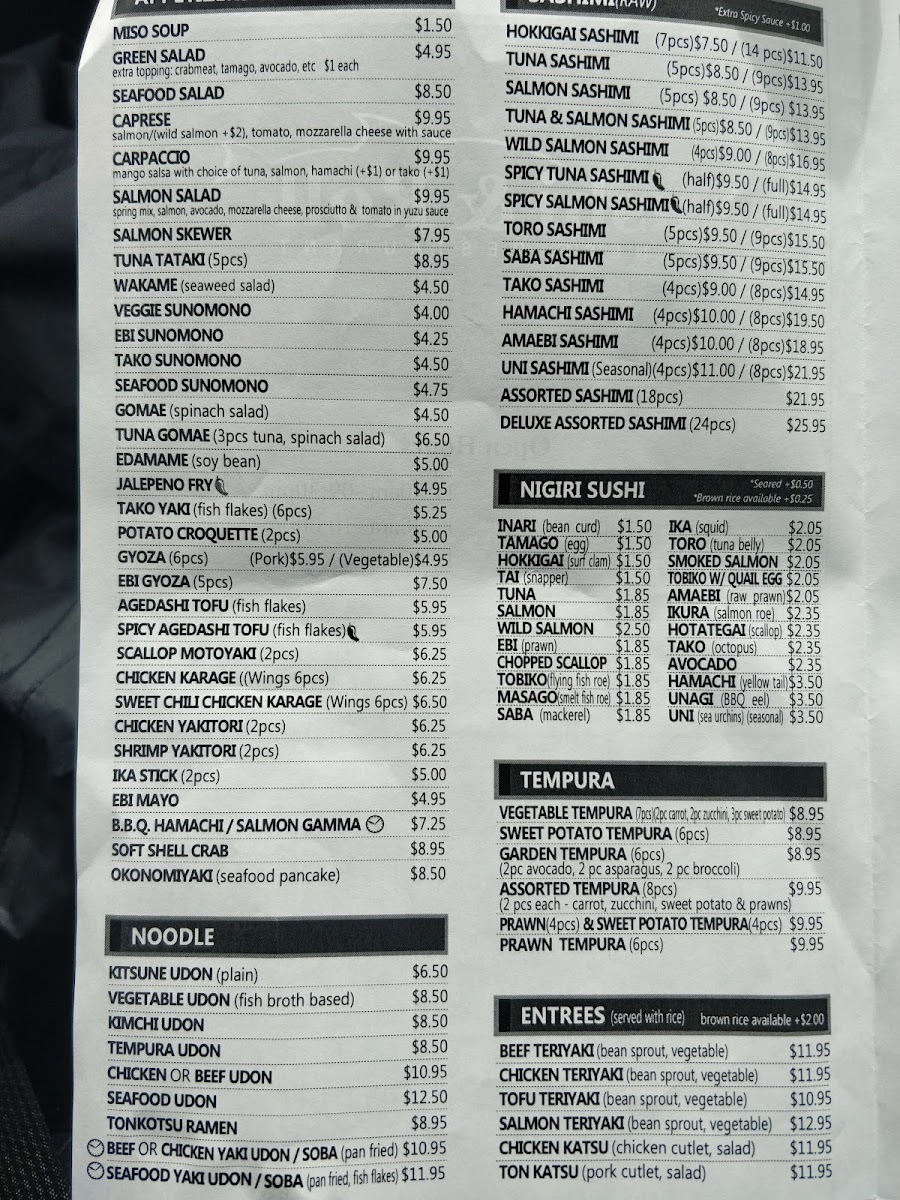 Entrees: This section includes teriyaki options featuring beef, chicken, salmon, and tofu, all served with stir-fried vegetables and a side of rice. These dishes provide a more substantial meal choice suitable for lunch or dinner.